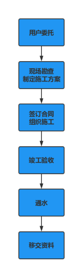 二、用戶委托---建設工程有限公司現(xiàn)場踏勘---供水施工方案---簽訂合同---建設工程有限公司組織安全文明施工---竣工第三方驗收---通水---移交(供水設施及技術檔案)