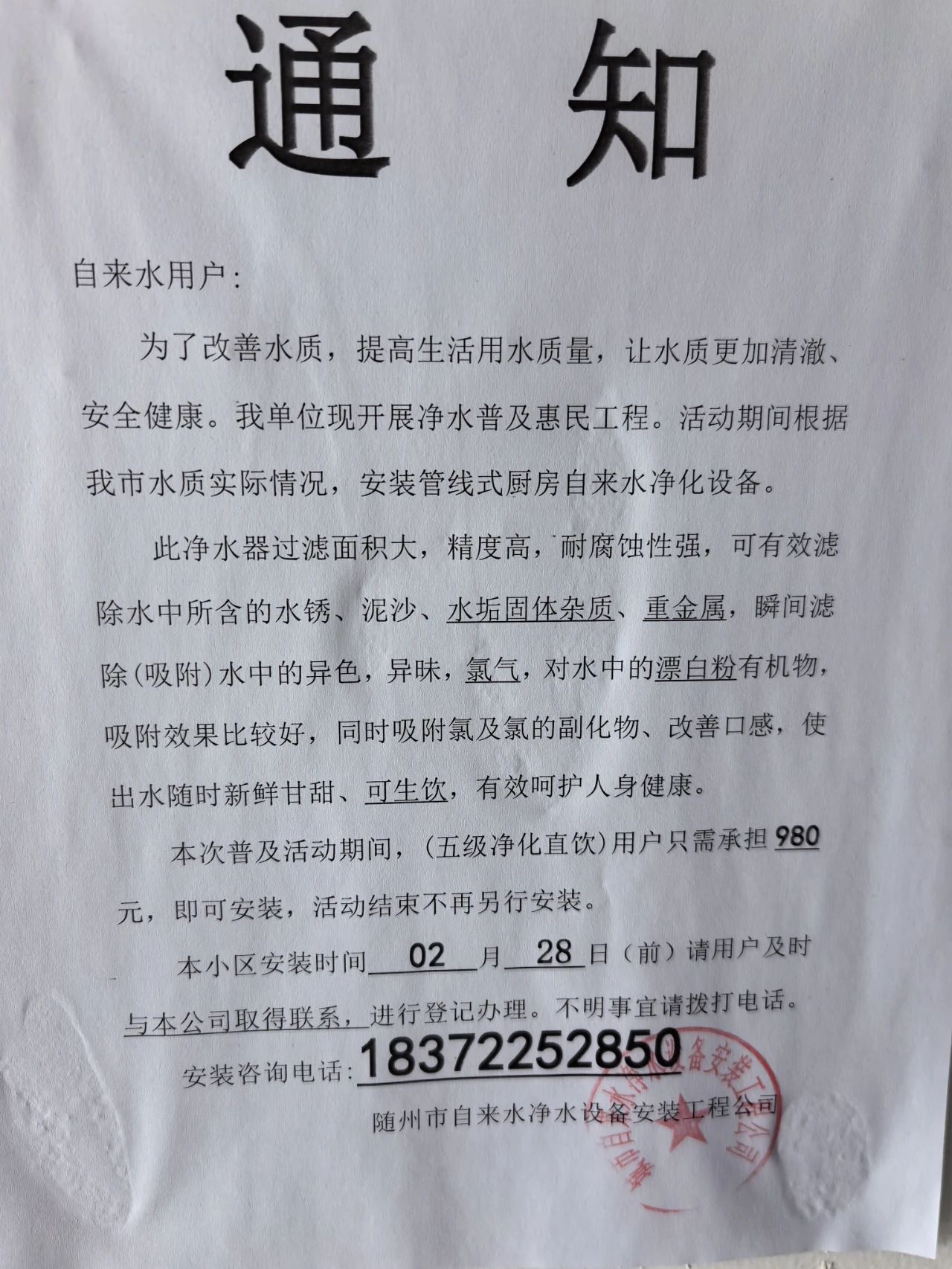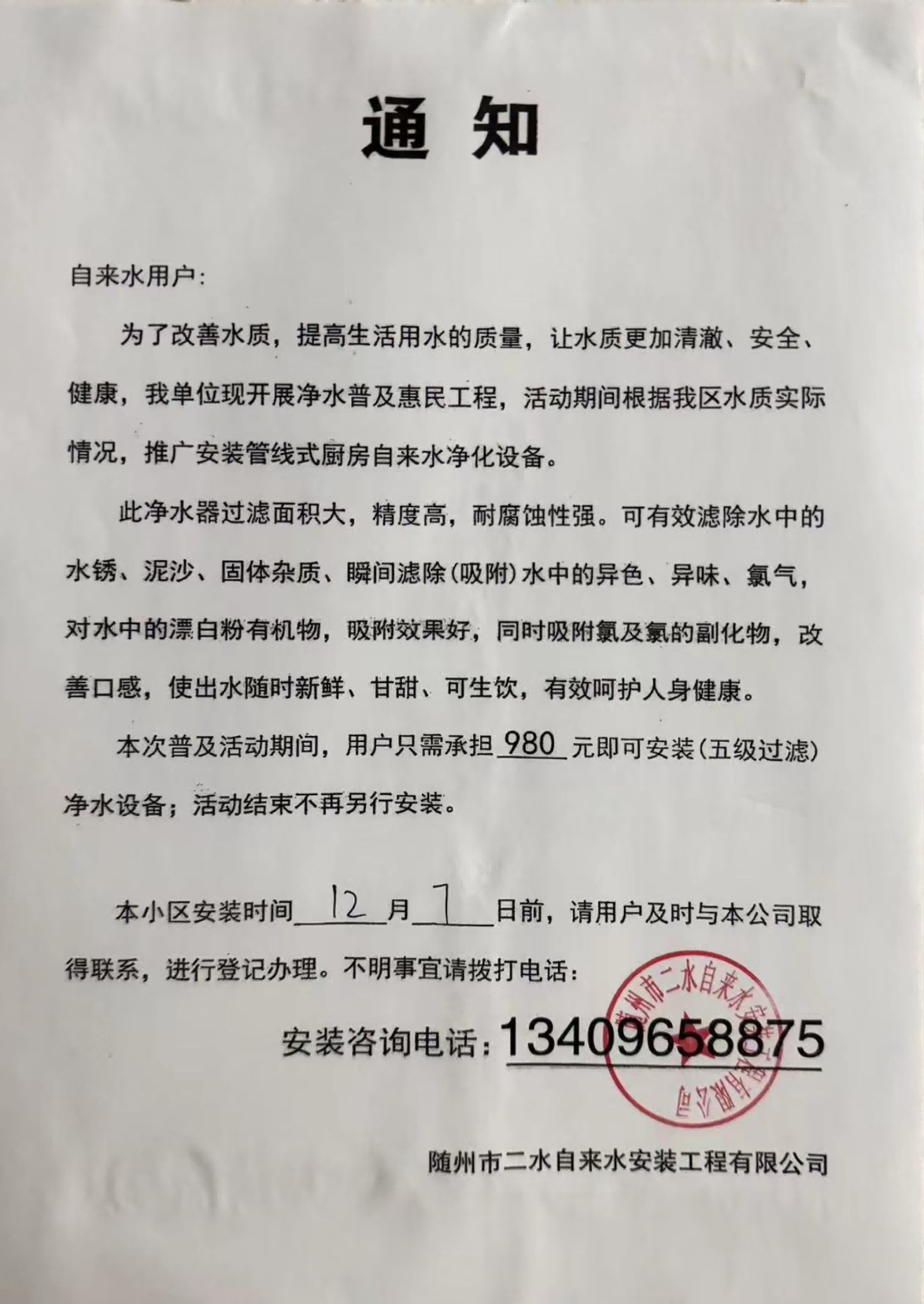 近期,我公司在隨州城區(qū)多個小區(qū)發(fā)現以“隨州市自來水凈水設備安裝工程公司”“隨州市二水自來水安裝工程有限公司”等公司名義張貼的《通知》。該行為打著改善自來水水質的幌子,誤導自來水用戶,推銷凈水設備,已造成惡劣影響。現為維護我公司和廣大市民的合法權益,特鄭重聲明如下: