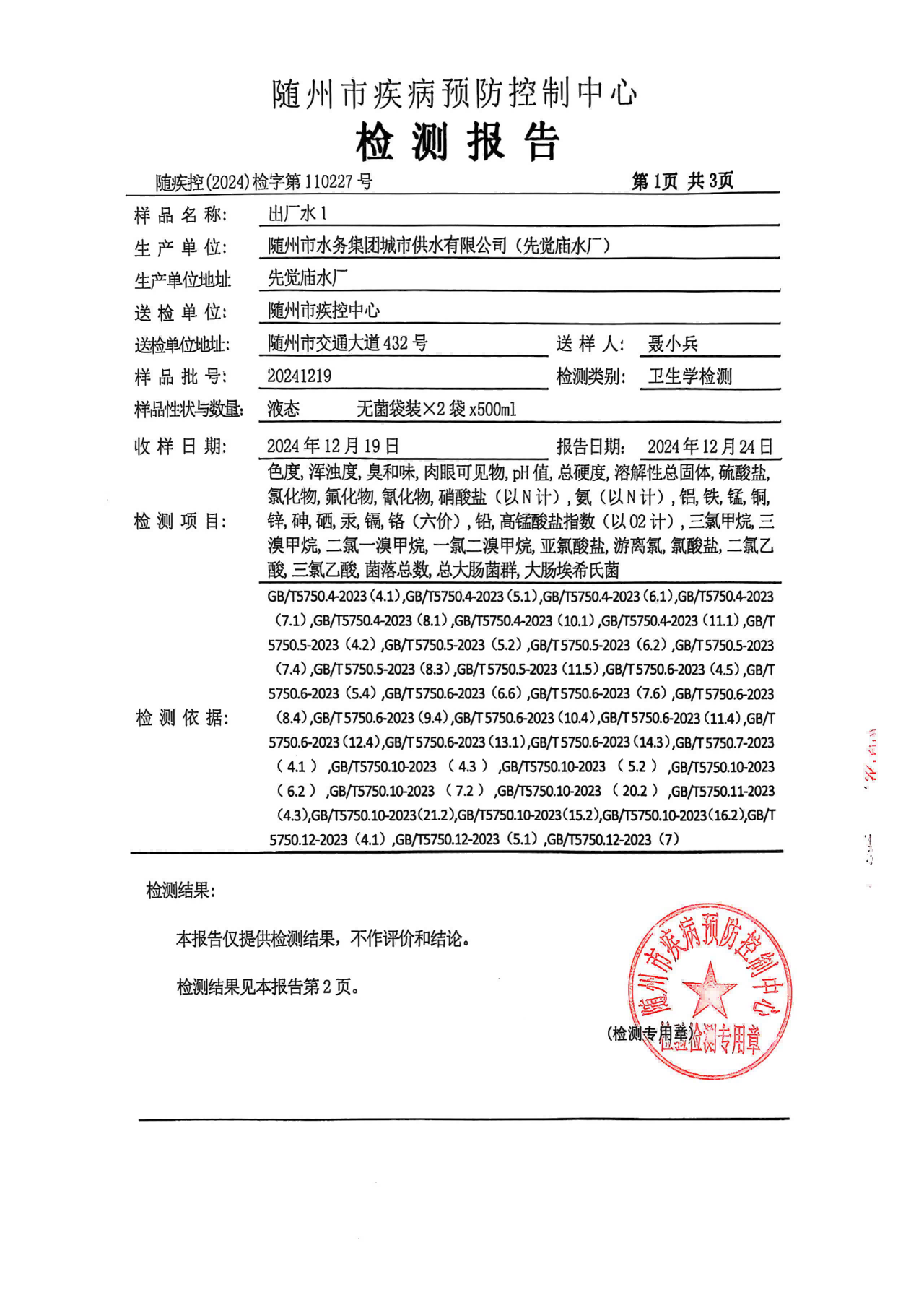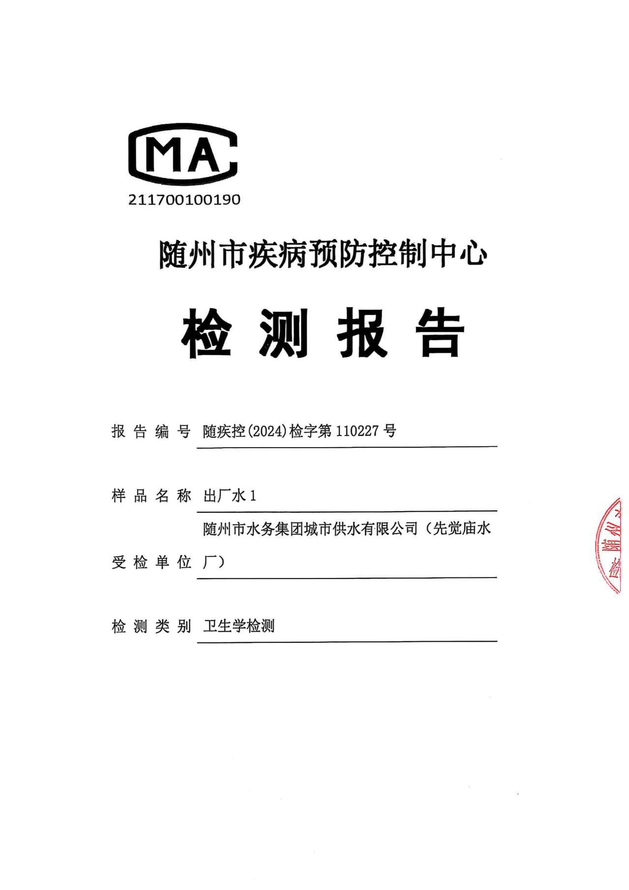 城市供水出廠水水質檢測報告